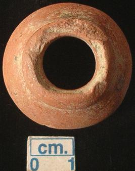 | Description / विवरण | A ghat shaped spindle whorle, fine fabric, wheel made, red in colour, the top mouth small hole with thick round ring where as bottom mouth big with flat base. |