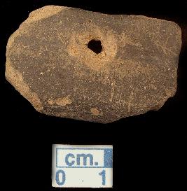 | Description / विवरण | A terracotta spindle whorl, black in colour, oval in shape, a perforation in center across, treated with black slip on both sides, greyish core. |