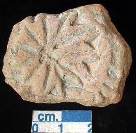 | Description / विवरण | Fragment of a potters stamp bearing spokes like incised designs with five dots in a circle in the centre. There are triangular notches between two spokes. |