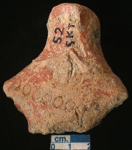 | Description / विवरण | Fragment of a toy bird, beak and back portion is broken, six incised circles on the upper side and four on the lower surface in a row. An applique design like necklace on the neck. A hole on the head possibly to pull the toy bird. |