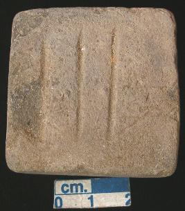 | Description / विवरण | Terracotta cake bearing three vertical horizontal incised lines. Rest the surfaces are plain. Greyish in colour. |