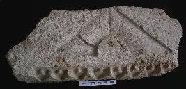 | Description / विवरण | Fragment of lintel of a small window Gavaksha made of fine grained sand stone. The lower face is decorated with engraved is triangles and figure of half lotus with fine leaves engraved in center. |