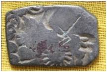 | Description / विवरण | The coin was the imperial type of Punch marked coin. The shape of the coin is rectangular. Obverse Sun tree, three arched hill, six armed chakra,Animal. Reverse An indistinct symbol. |
