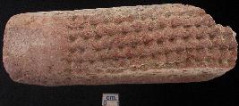 | Description / विवरण | Fragment of a terracotta skin rubber, red in colour,cylindrical body, multiple denticulation marks made in parellel rows, upper and lower surfaces are much frayed compare to sides, partly damaged. |