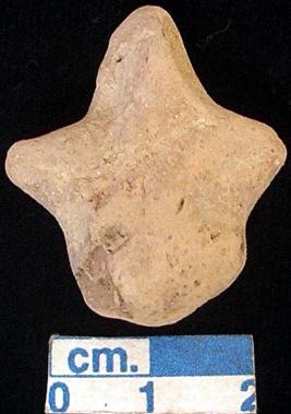 | Description / विवरण | An archaic terracotta human figurine with small head, red, pin hole eyes, pinched nose, short out stretched arms, both short wide bridged stumpy legs are broken, treated with red wash, handmade. |