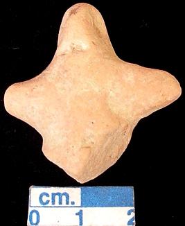 | Description / विवरण | An archaic terracotta human figurine with small head, red, pin hole eyes, pinched nose, open mouth, short out stretched arms, pin hole navel, both short bridged stumpy legs are broken, treated with red wash, handmade. |