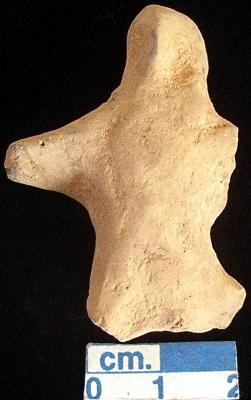 | Description / विवरण | An archaic terracotta human figurine with round head, dull red, pinched nose, short out stretched arms but the left one is broken, both legs are broken, blackish due to over firing, handmade. |