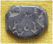 | Description / विवरण | The shape of the coin is irregular. This is an imperial type of Punch marked coin. Obverse Symbols of Sun, six armed symbol, tree. Reverse Symbol of Taurine. |
