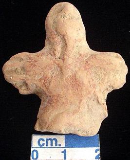 | Description / विवरण | An archaic terracotta human figurine with round head, red, pin hole eyes, pinched nose, open mouth, short out stretched arms with three incised lines, both legs are broken treated with red slip, handmade. |