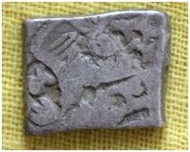 | Description / विवरण | The coin is rectangular in shape. Obverse Three taurine and three arrow around a circle, three arched hill with a crescent on the top, a vertical line flanked by flag, three arched gate. Reverse Taurines. |