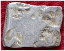 | Description / विवरण | The shape of the coin is rectangular. This is an imperial type of punch marked coin. Obverse Three arched hill, six armed symbols and tree. Reverse Crescent. |