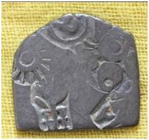 | Description / विवरण | The shape of the coin is irregular. This is an imperial type of punch marked coin. Obverse Sun, six armed symbol, leafless tree in a railing of six squares and two indistinct symbols. Reverse Blank. |