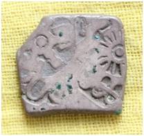 | Description / विवरण | The shape of the coin is irregular. This is an imperial type of punch marked coin. Obverse Sun, six armed symbol, three arched gate. Reverse Taurine. |