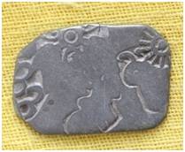 | Description / विवरण | The shape of the coin is irregular. This is an imperial type of punch marked coin. Obverse Sun, six armed symbol, six arched hill, hump bull. Reverse An indistinct symbol. |