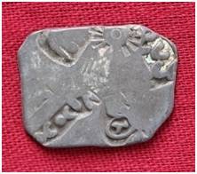 | Description / विवरण | The shape of the coin is irregular. This is an imperial type of punch marked coin. Obverse Sun, elephant, six armed symbol, three arched hill, a vertical line flanked by four taurine. Reverse A dot in circle flanked by two taurine, branches of tree. |