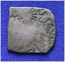 | Description / विवरण | The shape of the coin is rectangular. This is an imperial type of punch marked coin. Obverse Sun, six armed symbol and an indistinct symbol. Reverse A cross in a circle and two indistinct symbols. |