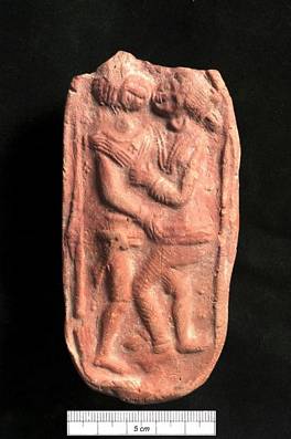 | Description / विवरण | Terracotta plaque depicting standing couple holding each other. Upper edge of the plaque is broken. |