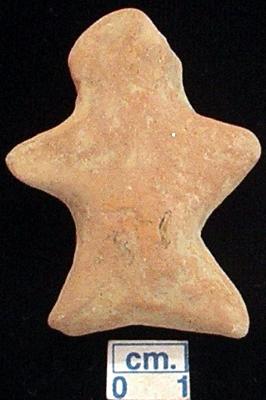 | Description / विवरण | A star shape archaic terracotta human figurine with round head, red, pinched nose, short out stretched arms, short wide bridged stumpy legs, treated with red wash, handmade. |