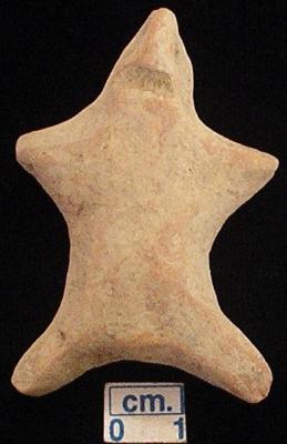 | Description / विवरण | An archaic terracotta human figurine with pointed head, red, pinched nose, punched eyes, slit mouth, short out stretched arms, short wide bridged stumpy legs, treated with red wash, handmade. |
