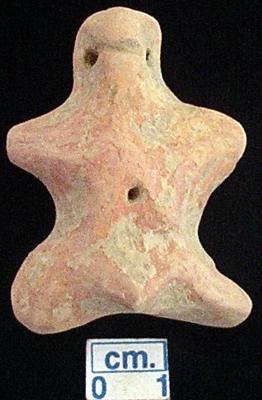 | Description / विवरण | A star shape archaic terracotta male figurine with small head, red, pinched nose, punched eyes, slit mouth, short out stretched arms, punched navel, short wide bridged stumpy legs, phallus indicated, treated with red wash, handmade. |