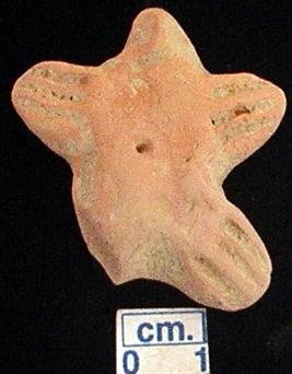 | Description / विवरण | A star shape archaic terracotta human figurine with pinched head, red, pinched nose, punched eyes, slit mouth, short out stretched arms with three incised lines on each, punched navel, short wide bridged stumpy legs with thre incised lines but the right one is broken, treated with red wash, handmade. |