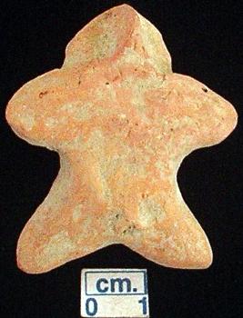 | Description / विवरण | A star shape archaic terracotta male figurine with round head, red, pinched nose, short out stretched arms, short wide bridged stumpy legs, pinched phallus, treated with red wash, handmade. |