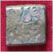 | Description / विवरण | The shape of the coin is square. This is an imperial type of punch marked coin. Obverse Caduceus, six armed symbol, Branches of tree, animal. Reverse An indistinct symbol. |