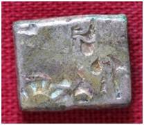 | Description / विवरण | The shape of the coin is square. This is an imperial type of punch marked coin. Obverse Sun, two arched hill and an indistinct symbols. Reverse Triskeles. |