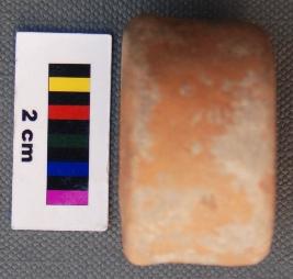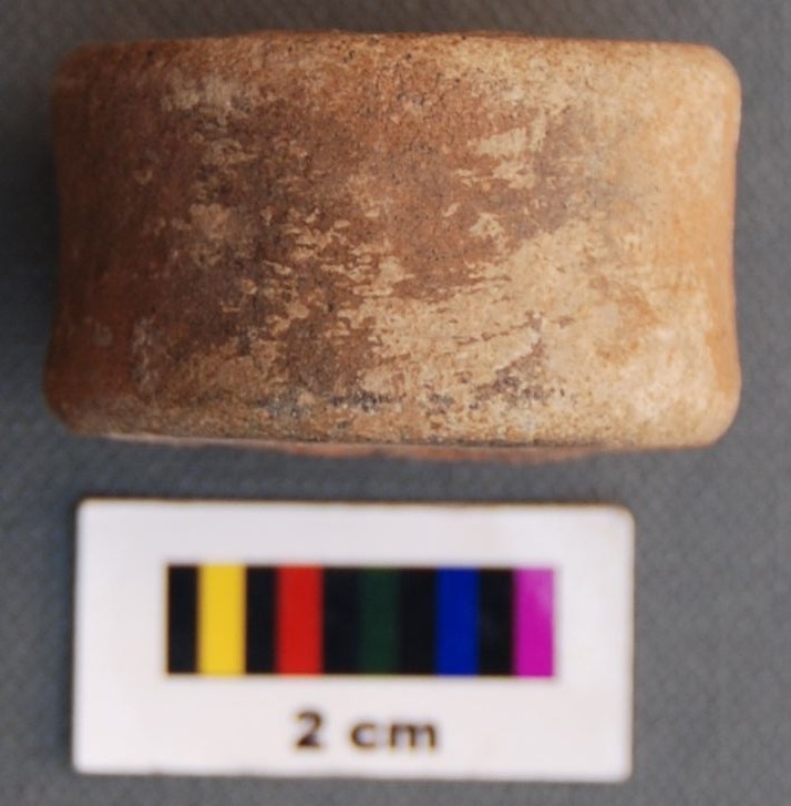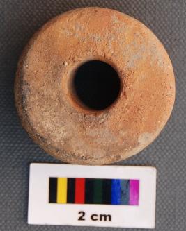 It is cylindrical terracotta object and has thick section and large perforation. It is treated with red slip. It may have been used a bead.