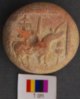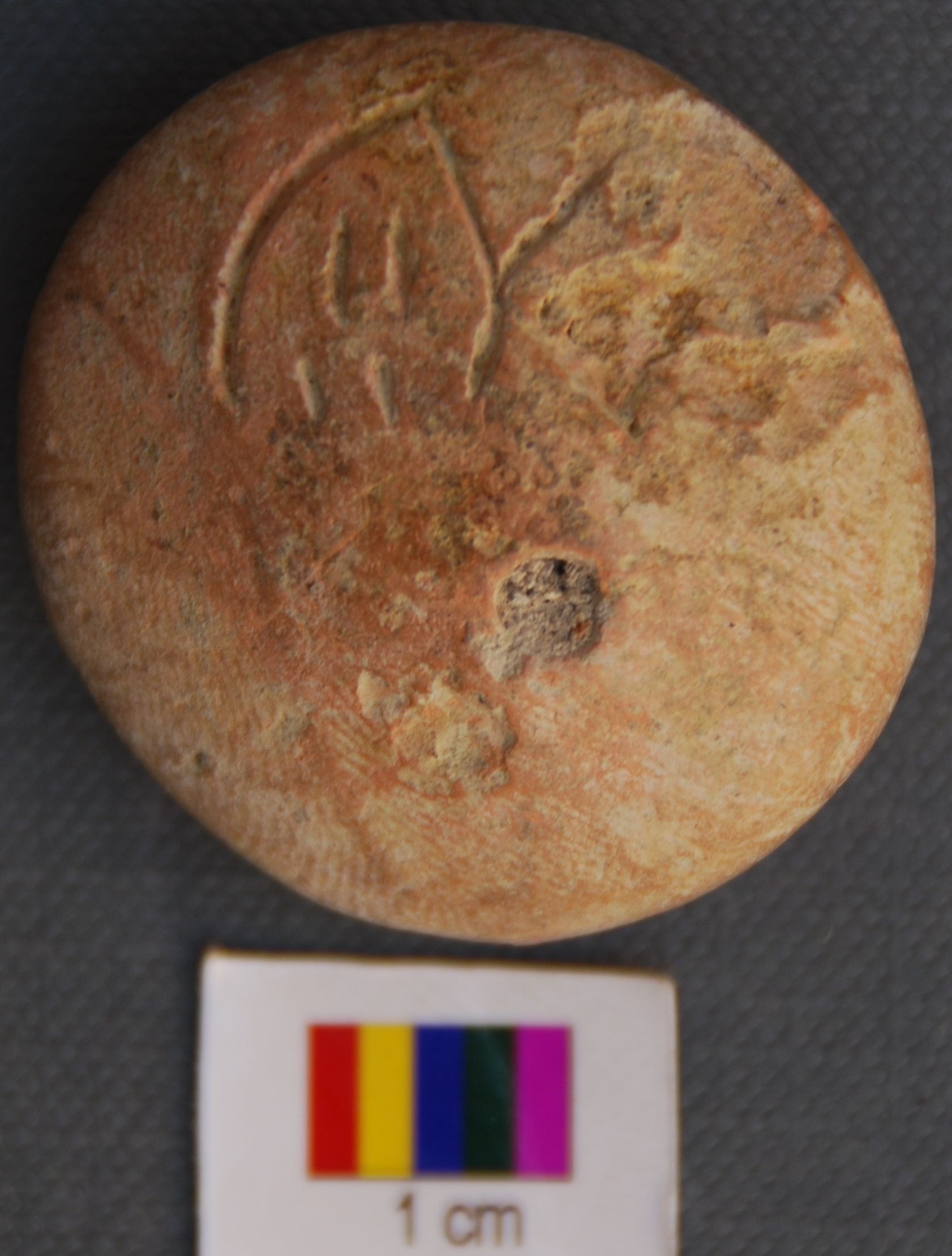 It is circular on plan with a hole slightly off the center. It is flat on obverse and convex on the reverse. It has Harappan letters on the reverse and partially broken on both side. It has been stamped by Harappan seal, which depict a unicorn, a ritualistic object infront and Harappan letters on top.