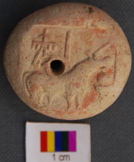 It is circular on plan with a hole slightly off the center. It is flat on obverse and convex on the reverse. It has Harappan letters on the reverse and partially broken on both side. It has been stamped by Harappan seal, which depict a unicorn, a ritualistic object infront and Harappan letters on top.