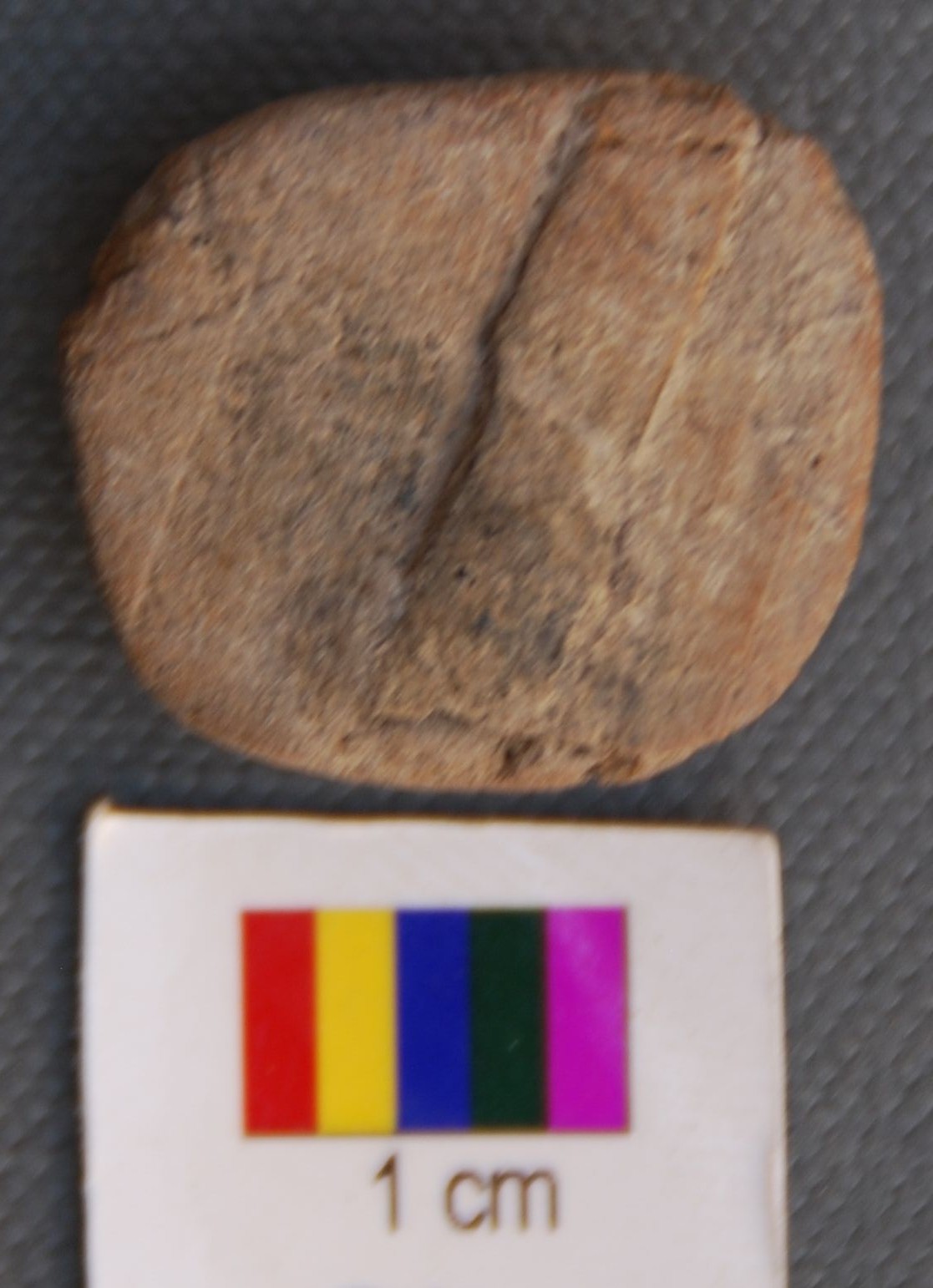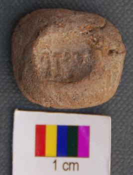it is squarish terracotta object, flat on the reverse and bulging on the obverse with Brahmi letters on a shallow face.