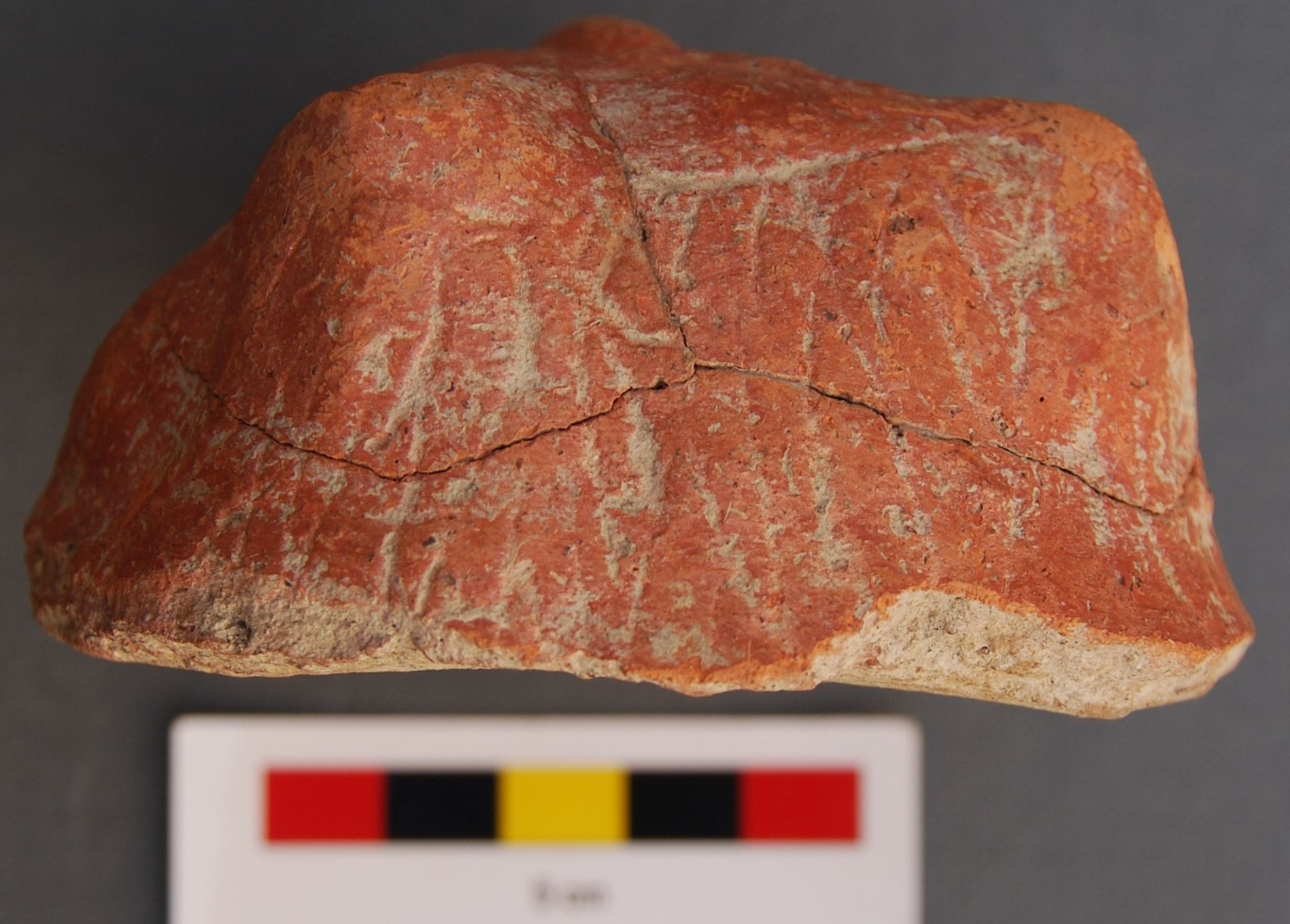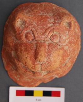 It looks like face of a lion, which is broken from neck portion. It is treated with red slip.