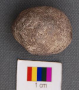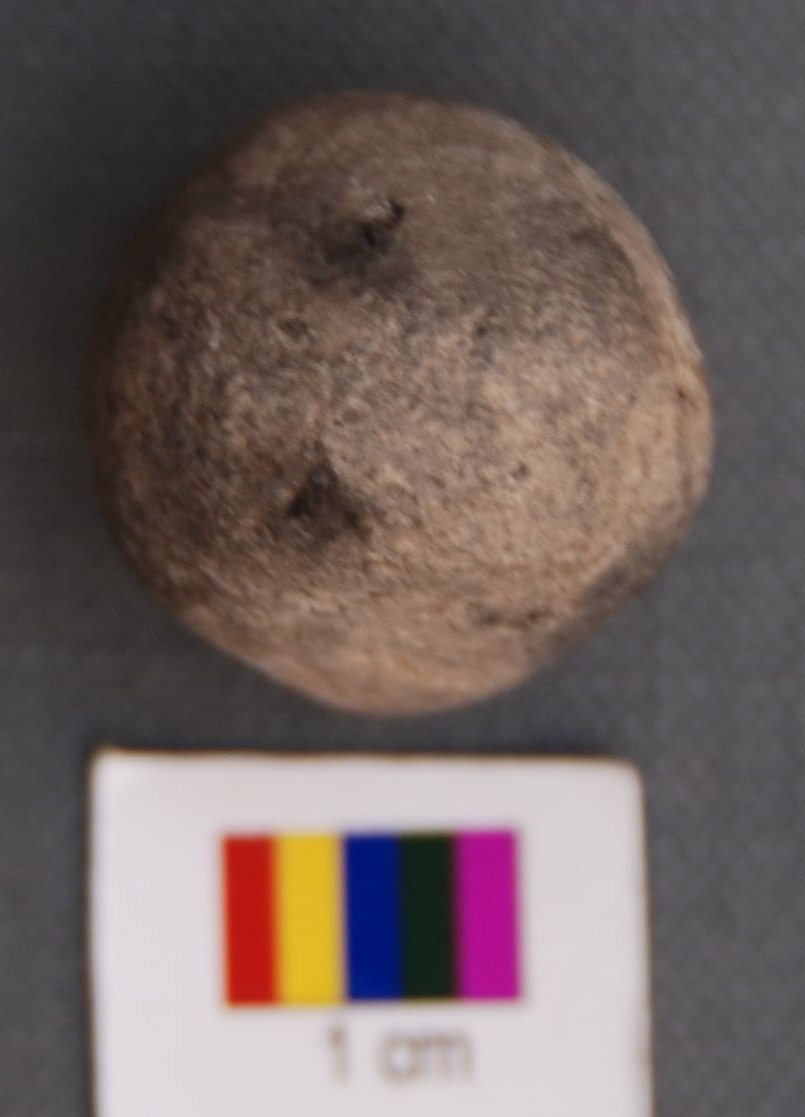 It is a oblong facetted terracotta object, which looks like a sling ball. It is fired at high temperature, though not uniformally.