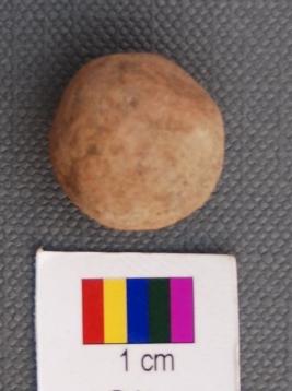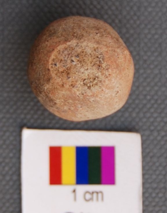 It is spherical terracotta ball, fired at high temperature. It has irregular surface.