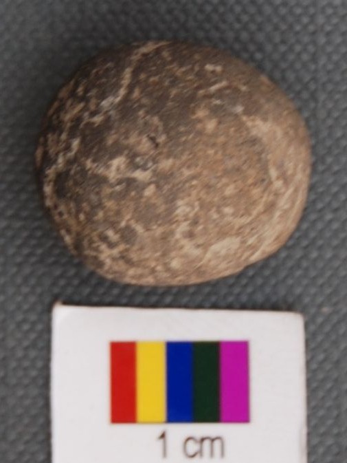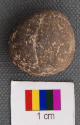 It is roundish terracotta ball fired at high temperature. It is greyish in appearance perhaps fired in reduced condition.