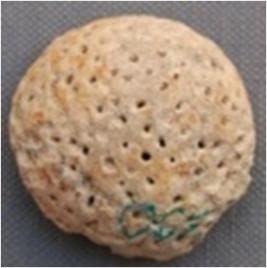 It is spherical terracotta ball, the surface of which has uncountable holes at different interval. These holes were perhaps prepared to decorate the object. It could also be a bead. It is fired at high temperature.