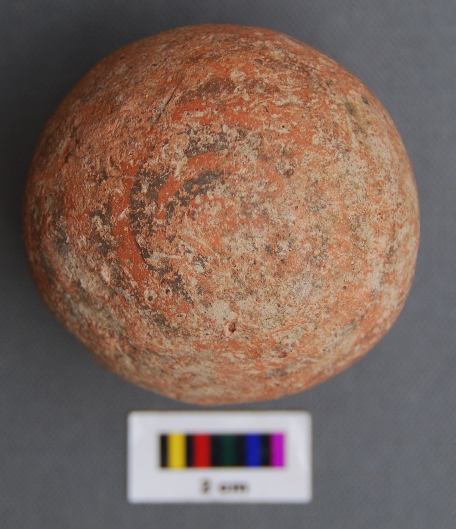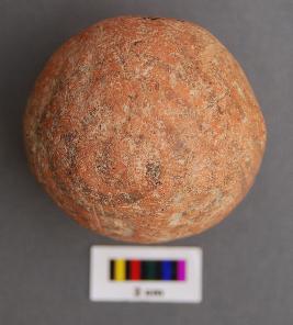 It is a spherical terracotta ball, which is hollow inside. There is some unknown object inside which sounds while moving or shaking it. It may have been used as amusement for new born babies. The painting has largely disappeared.