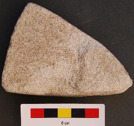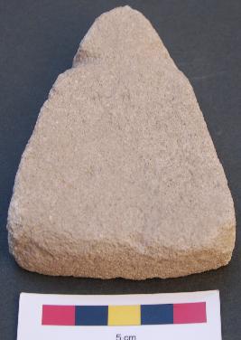| Description / विवरण | It is a triangular sand stone object which has polished arms. There are two depressions which appear to be result of bead polishing. |