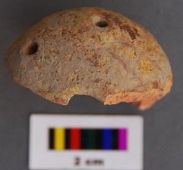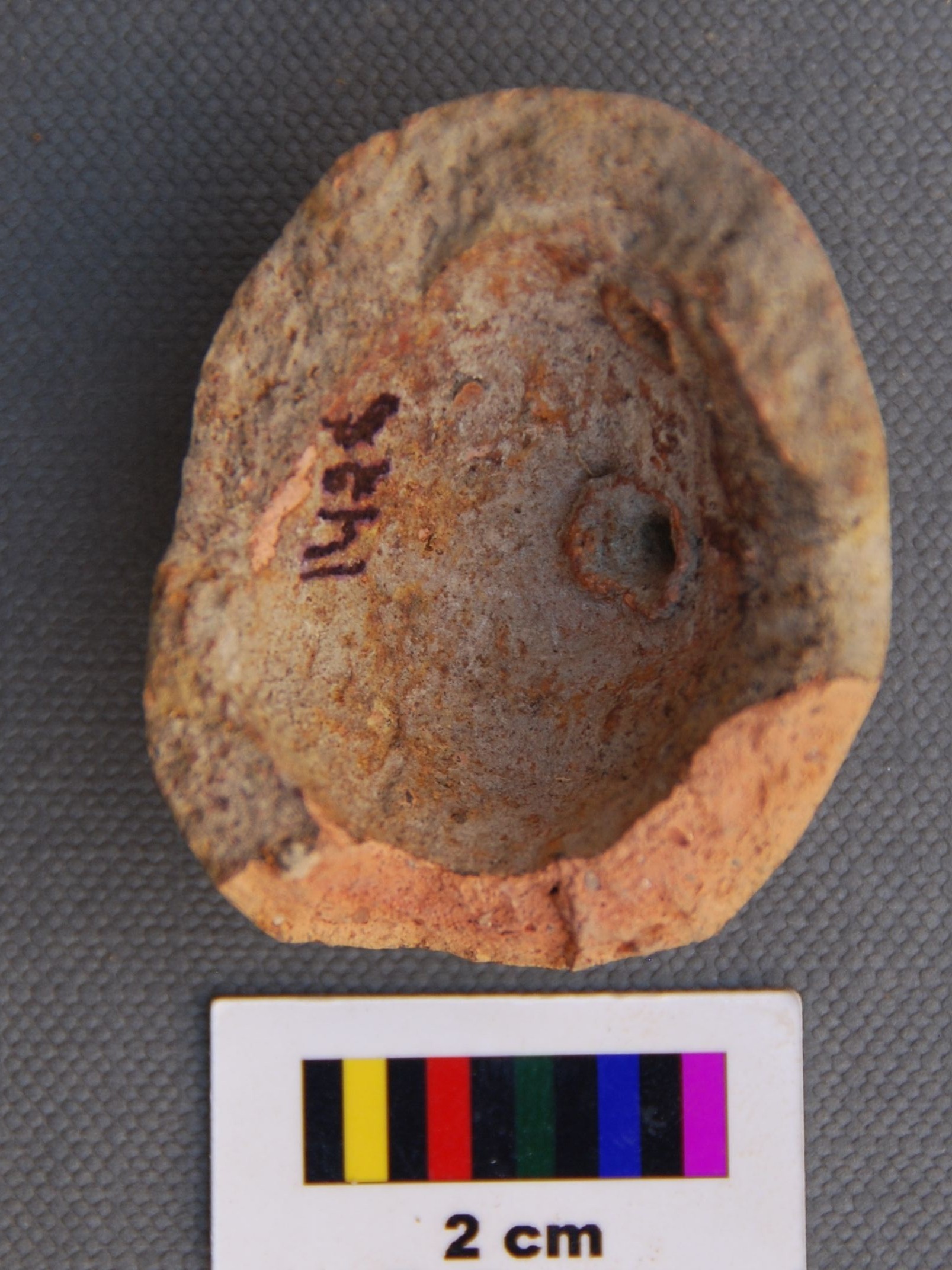 It is half broken topy pot which may have been spherical in shape. It is a very small opening. It is made of fine clay and fired at high temperature, though its thickness not uniform.