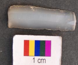 | Description / विवरण | It is fragment of a blade of agate parallel sides. Both sides are retouched. It has thick body. |