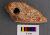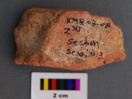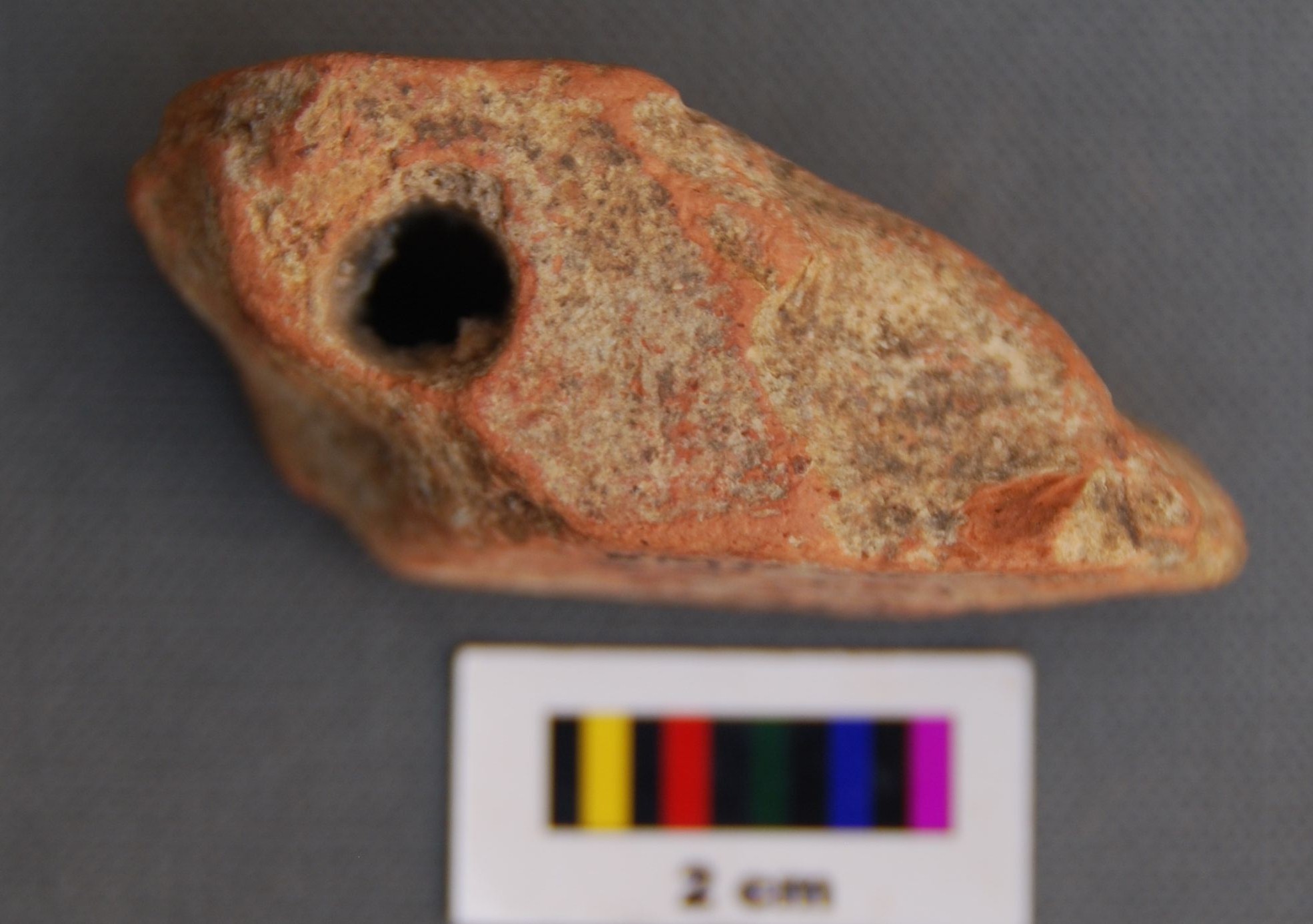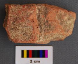 It is perhaps fragment of a toy cart, which is flatish in appearance. It is made of fine clay. It has been treated with red slip.
