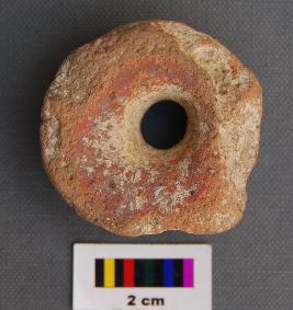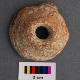 | Description / विवरण | It is an unusal kind of terracotta object, which looks like a toy pot. It has tapering sides and flatish on the base and top with featureless rim. Of course a small portion of rim is slightly pronounced. There is a perforation in the central part. |