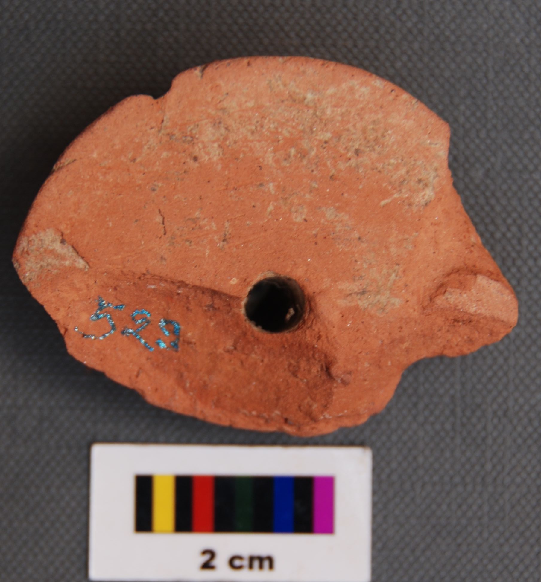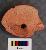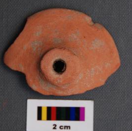 It is a broken terracotta spindle whorl. It is flat on one side and bulging on the other. It has a disk type base.