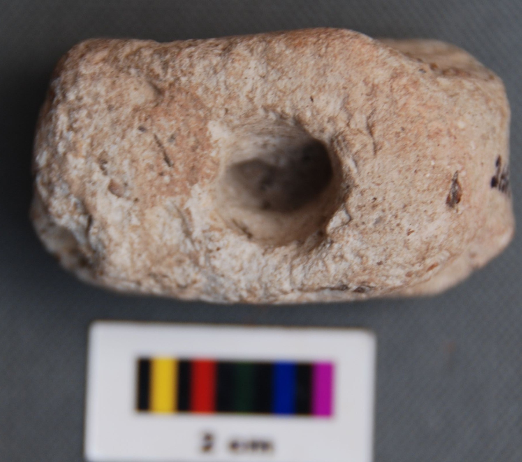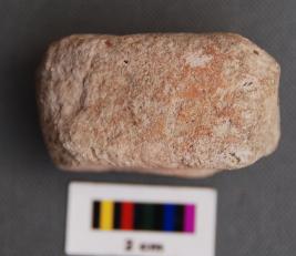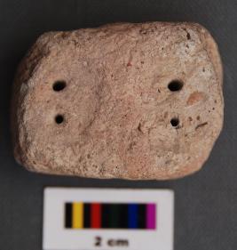 It is a rectangular terracotta object with a prominent hole on its longer axis. There are a few more smaller perforation in the upper part of the body.