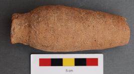 | Description / विवरण | It is cylindrical bottel type toy pot, which looks like goblet. Its rim part is broken and has squat type base. It has small opening and its body gradually swollen towards base. |