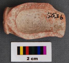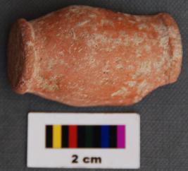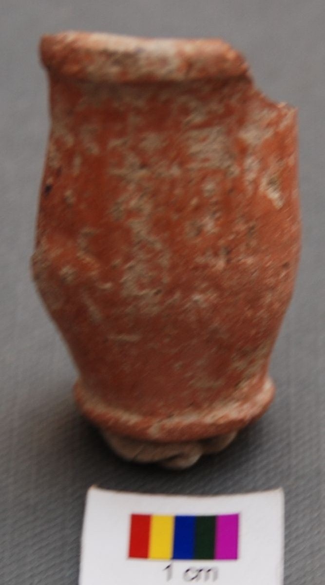 It is miniature goblet type pot. It has flat base and slightly swollen body, which gives impression of blunt carnation. It has externally projecting rim. It is treated with red slip and burnishing.