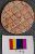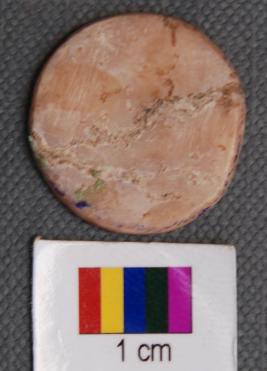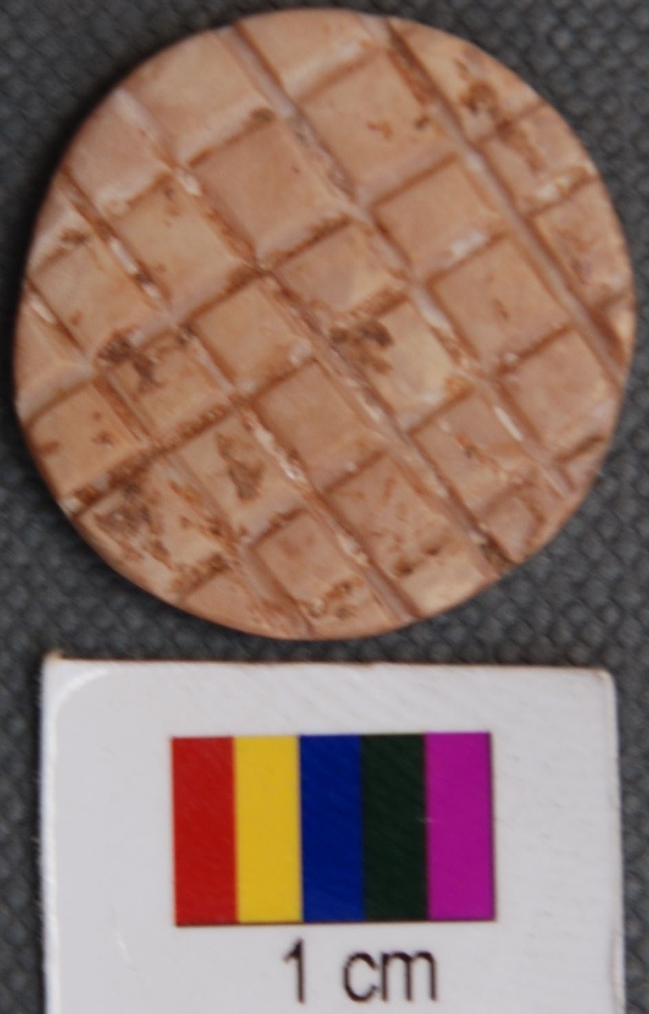 It is circular object of shell. One one side there are horizontal and vertical lines intersecting each other.