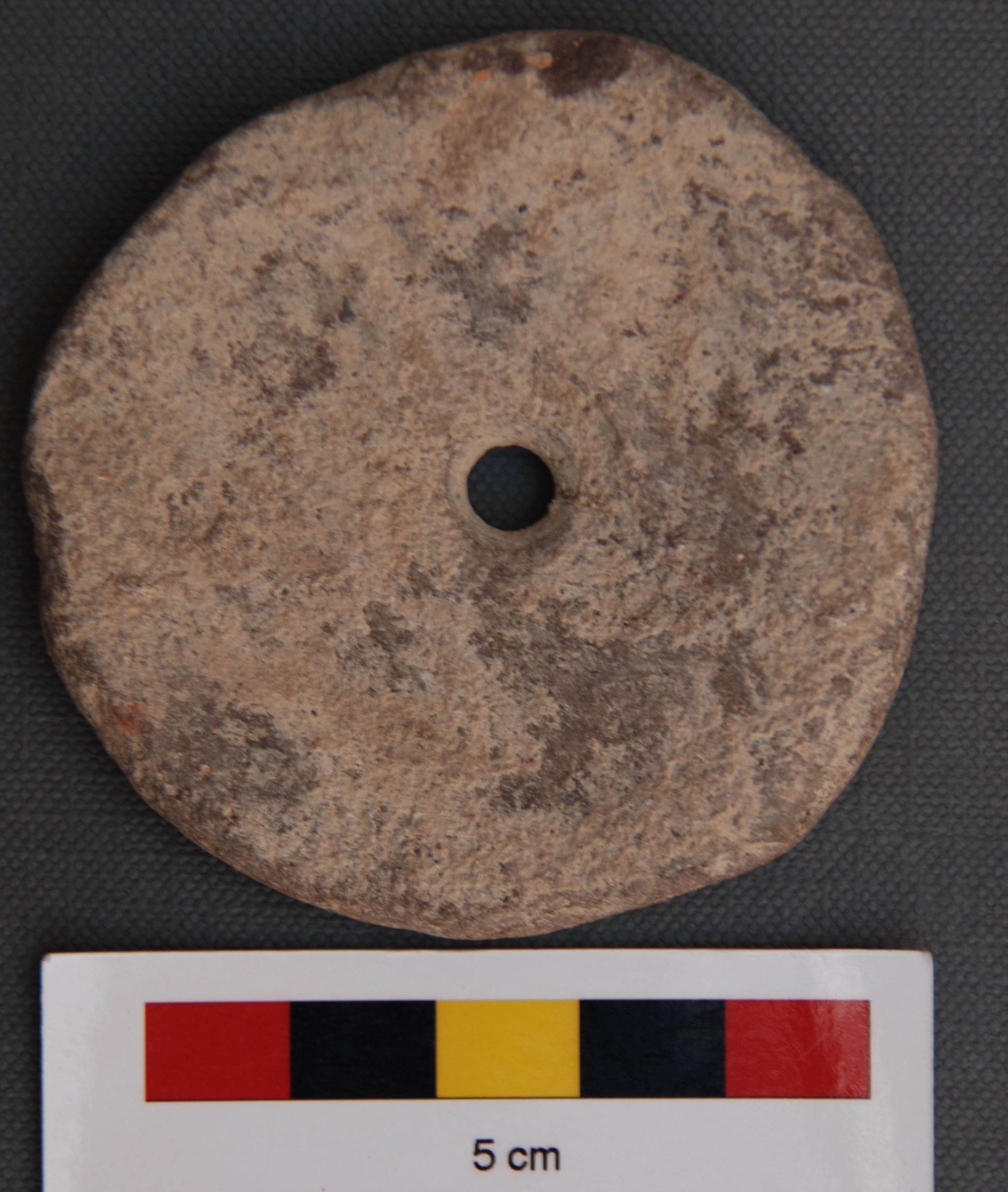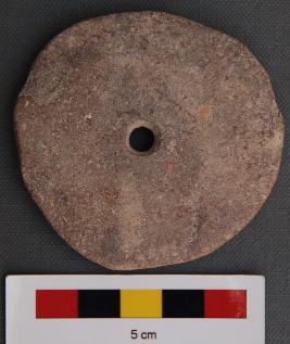 It is circular perforated terracotta disc. It is made of body part of pot.