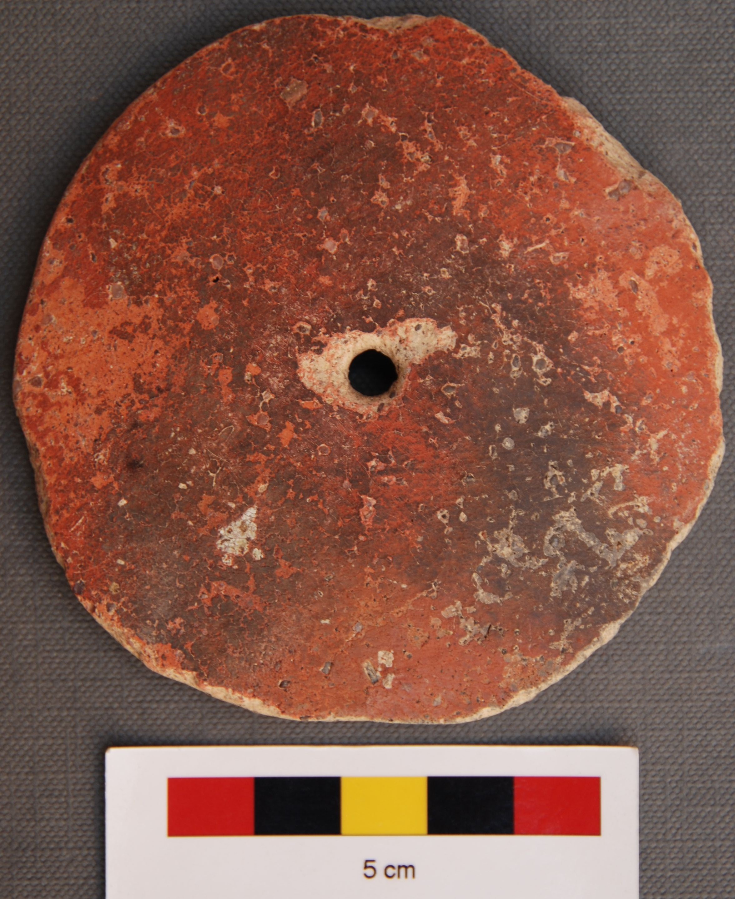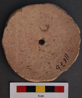 It is a large terracotta perforated disc. It may have been made out of a body sherd of a pot as its shape would indicate.